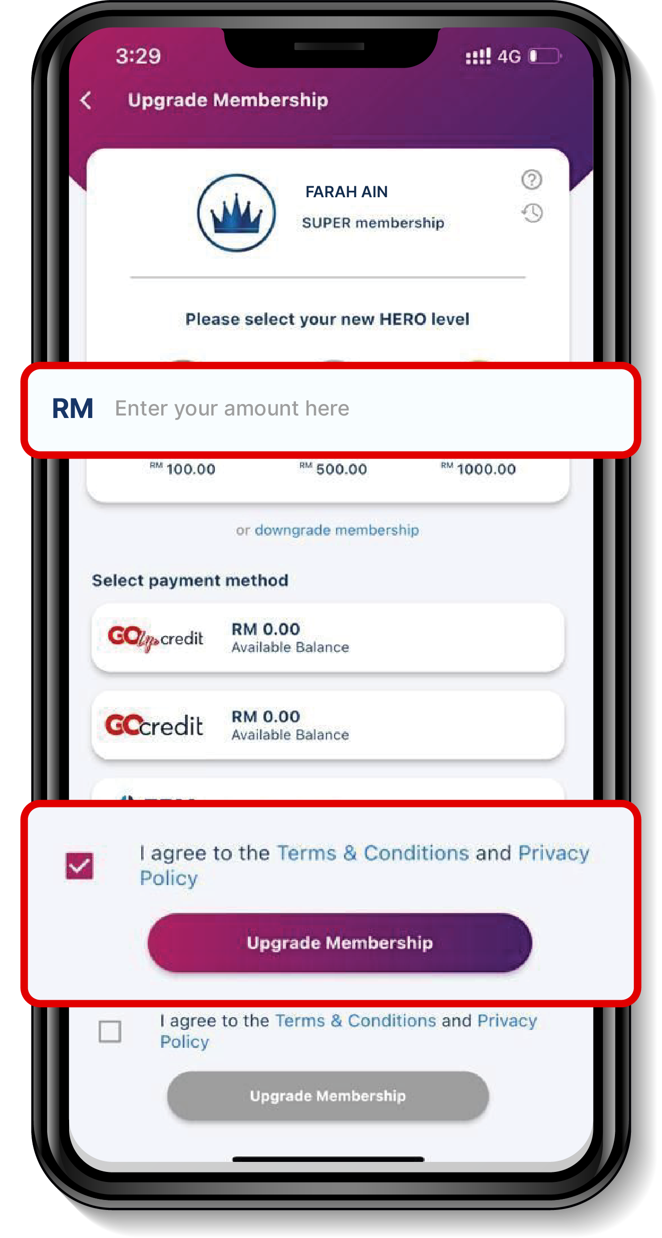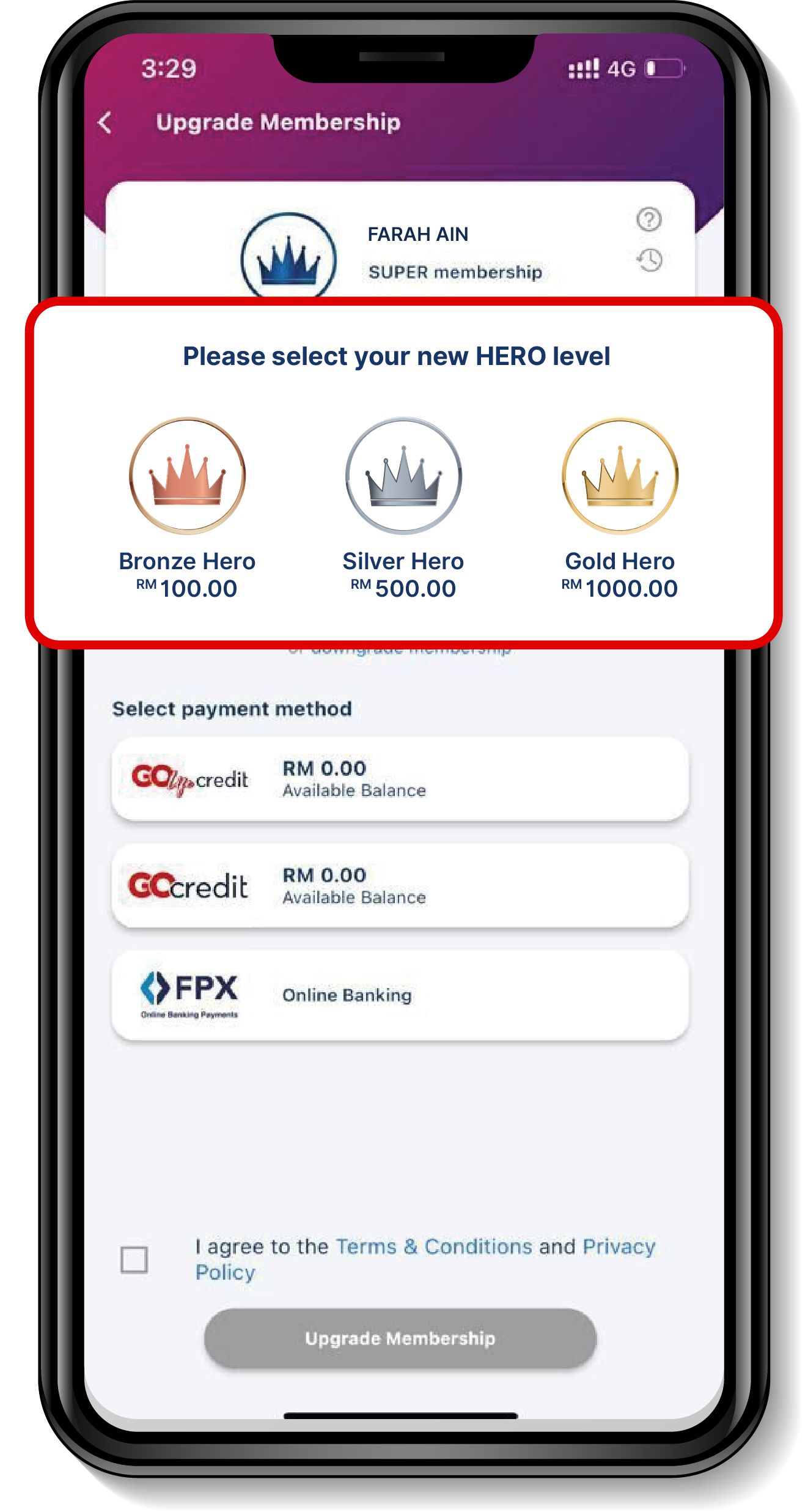 Pilih kaedah “pembayaran” kemudian klik pada kotak “terma & syarat” & tekan pada upgrade Membership
